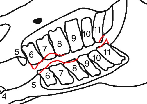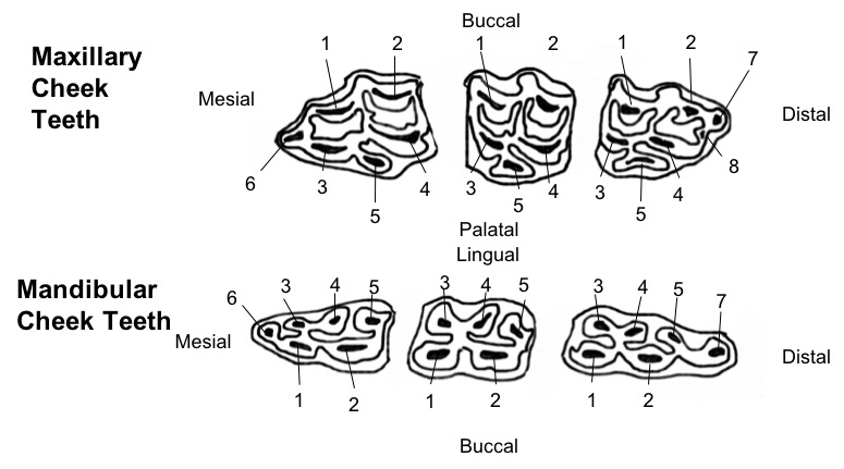 Parasagittal fractures through pulps no1 and no2 can be present in both maxillary and mandibular cheek teeth. The missing portions of these teeth are commonly shaded out (Fig 6).