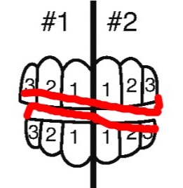 Midline sagittal fractures through the infundibula of the maxillary teeth are drawn similarly if a portion is missing. If both portions are present they are drawn as displacements with a black line in between over the infundibula (Fig 7).