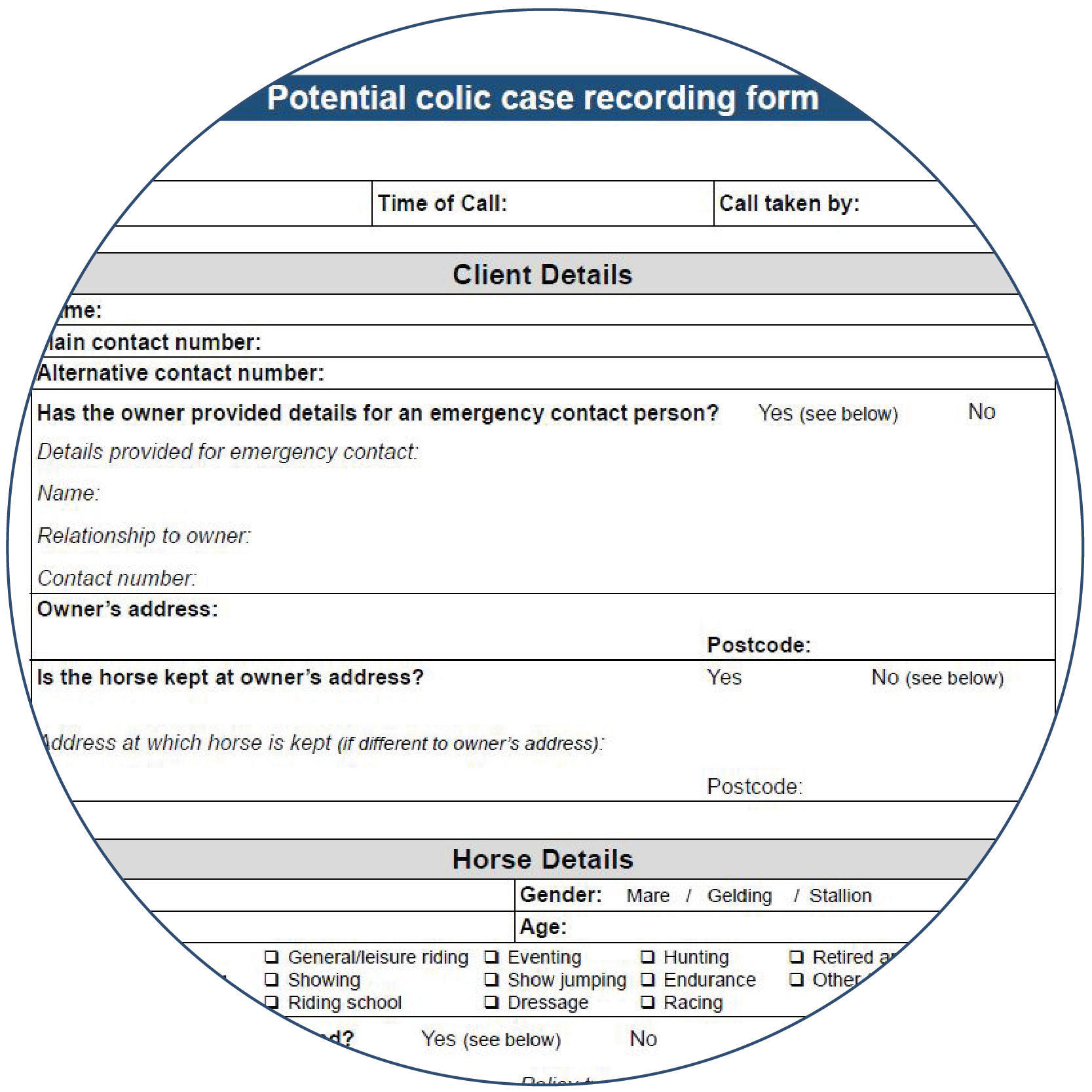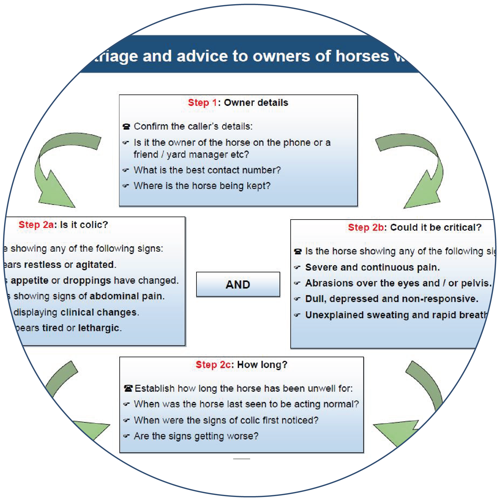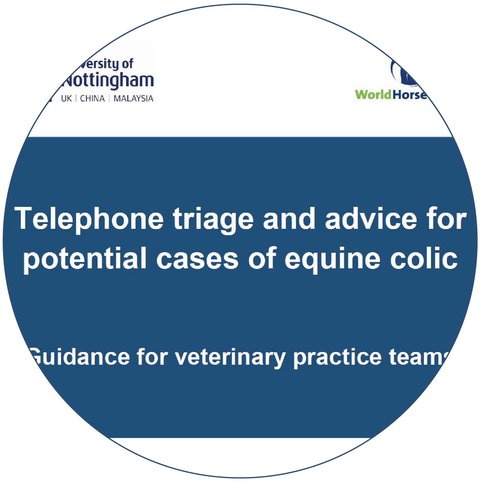 The process of triage is widely used within human medicine to identify and prioritise those who require urgent medical attention. Equine colic is a frequent emergency within veterinary practice however, owner knowledge of colic and recognition of potential 'red-flag' indicators is varied. To assist veterinary teams in assessing owner-reported colic during a telephone call, the University of Nottingham and World Horse Welfare have developed a bespoke telephone triage resource for use within practice. This resource has been created following an exploratory study into existing triage processes within equine practice, using an online survey and structured interviews with veterinary teams. Although these resources have been produced for use during colic related telephone calls, the principles can be adapted and applied to other potential equine emergencies.